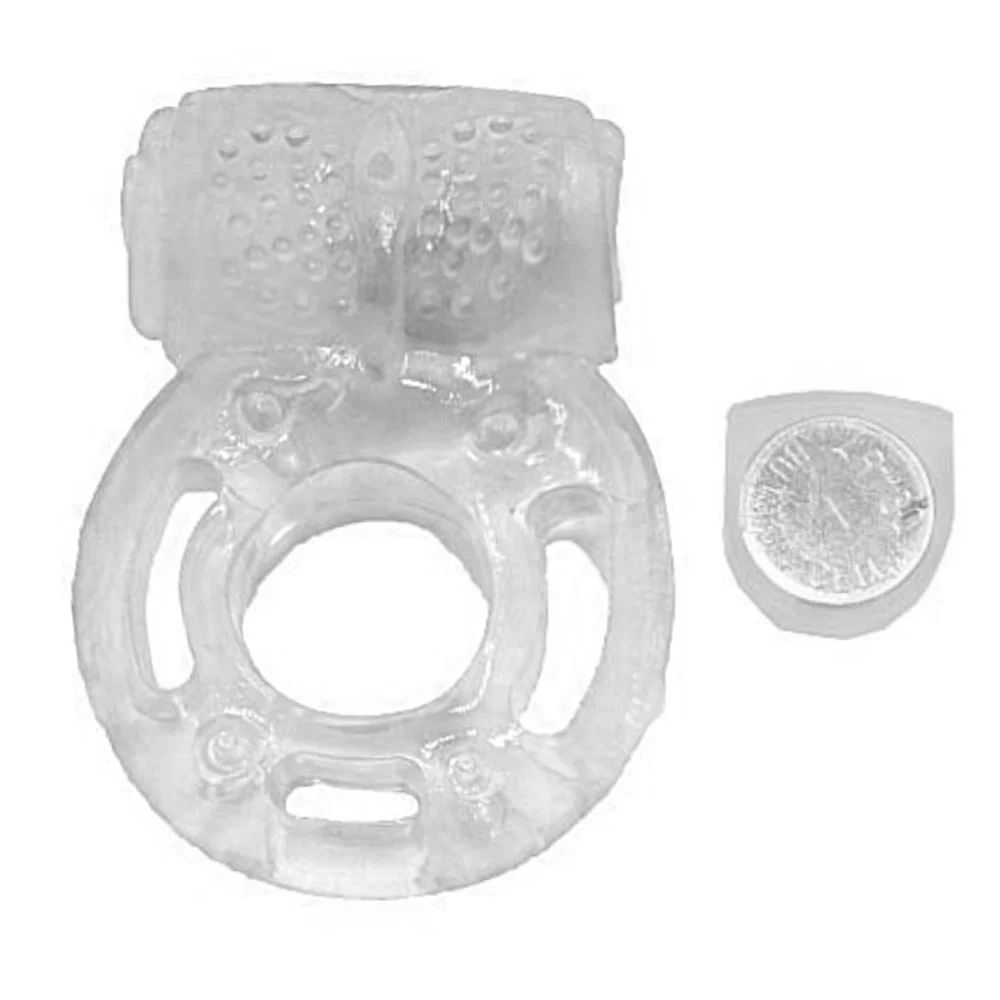 Anel peniano com cápsula vibratória e saliências massageadoras em formato de borboleta.